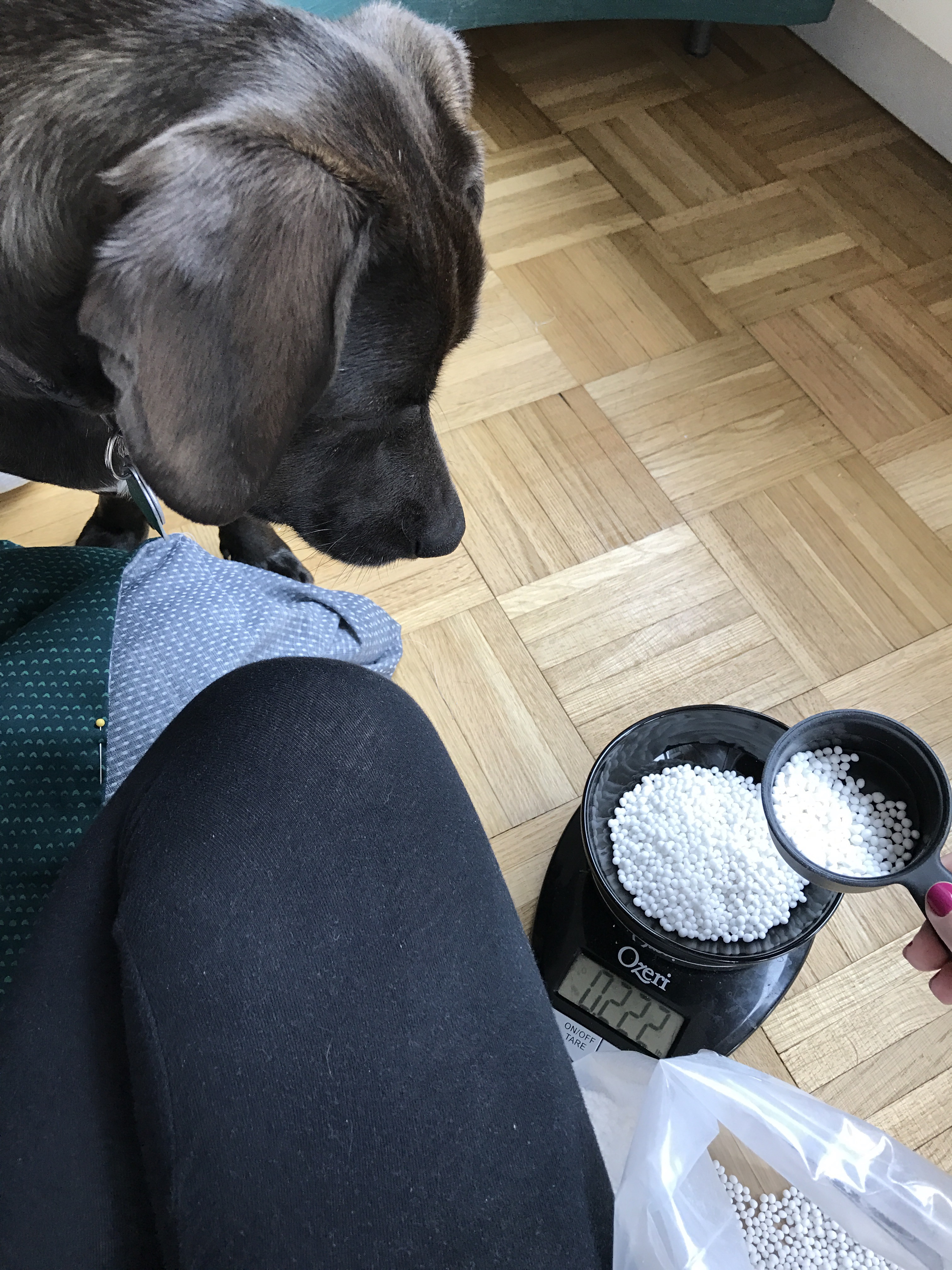 - Assemble your materials. You’ll need: fabric, polly pellets, a kitchen scale, a piece of paper to make into a funnel, a bowl, a scoop (I used a measuring cup), a tape measurer, fabric chalk, thread, sewing machine, and pins. You’re also going to want a big space to work at first, as you’ll need to pin a lot for the first set of stitches.